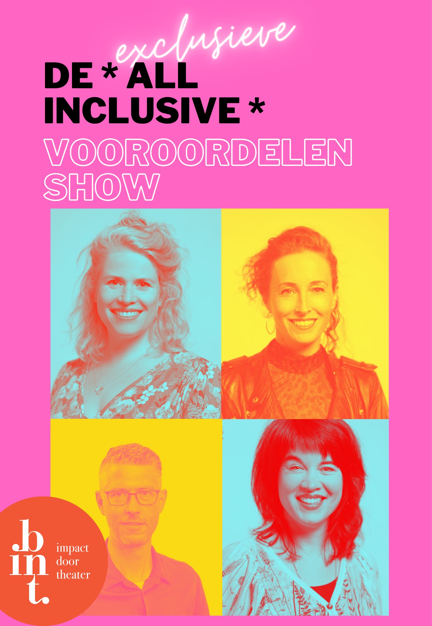 In de Exclusieve All Inclusive Vooroordelen Show ontmoeten we live op het podium steeds nieuwe gasten die te maken krijgen met vooroordelen. Echte mensen met levensverhalen. Mensen die je normaal misschien niet zo snel zou spreken. Denk aan een transgender persoon, veganist, imam of een vluchteling. Iemand die afwijkt van de ‘norm’ en daardoor de kans loopt anders benaderd, buitengesloten of gediscrimineerd te worden. We mogen ze alles vragen en vanuit hun ware verhaal maken wij theater. Een intieme, eerlijke en vrolijke voorstelling die voelbaar maakt hoe het is om je anders te voelen, en mensen laat nadenken over wat zij zelf kunnen doen om de ander zich welkom te laten voelen.